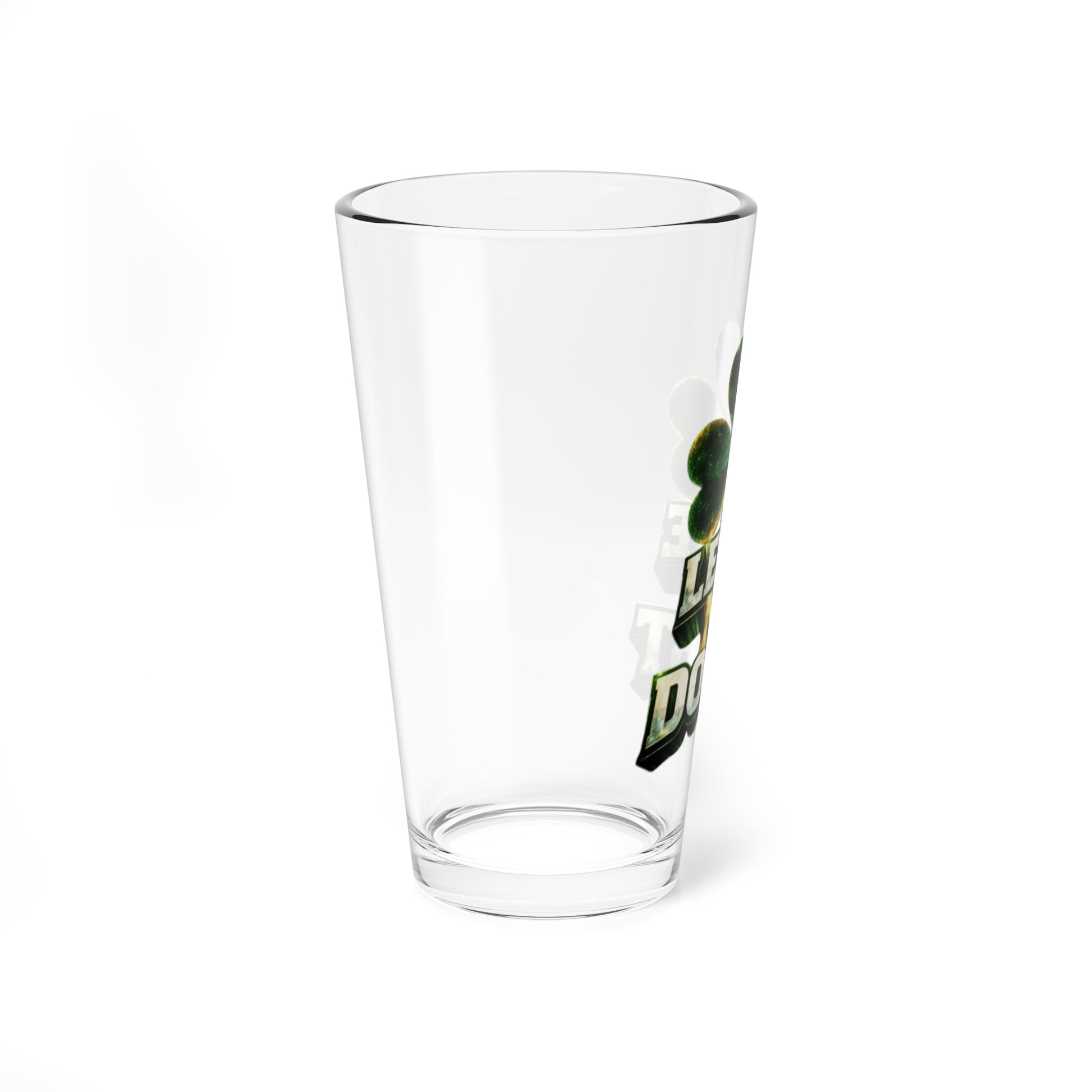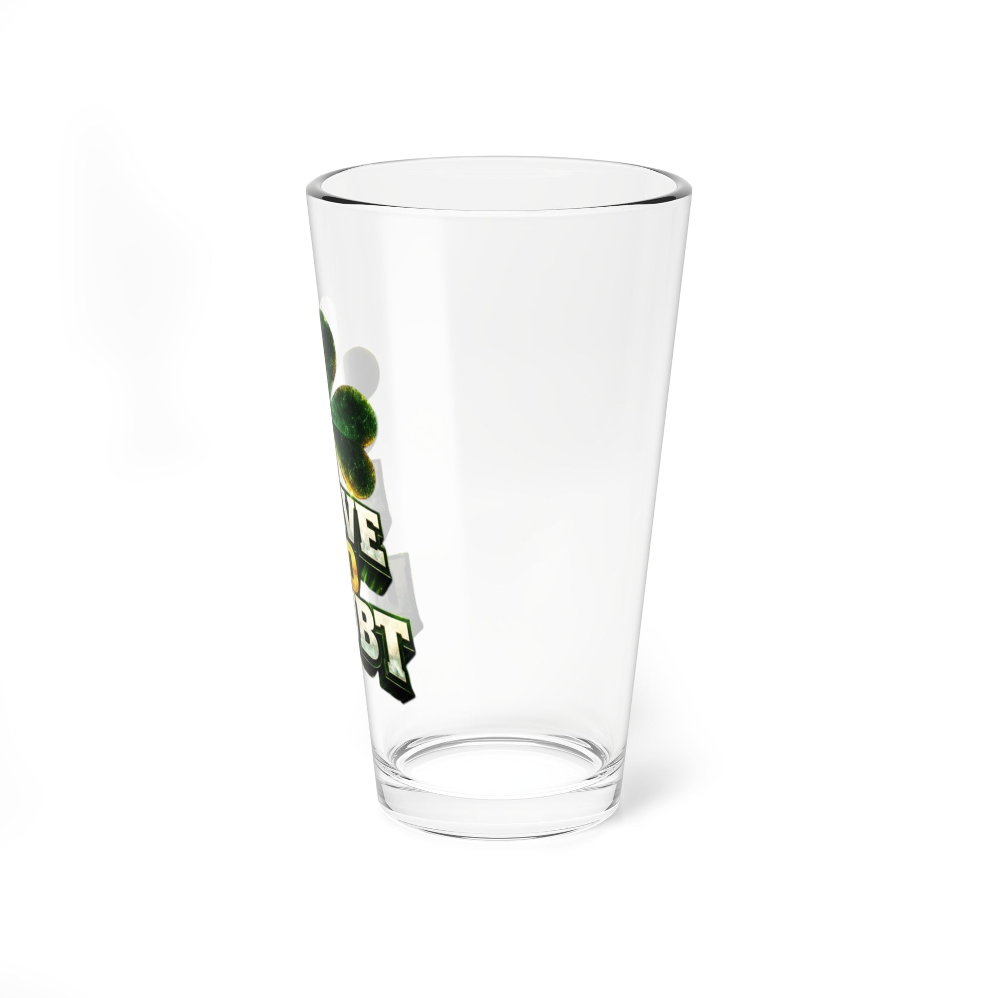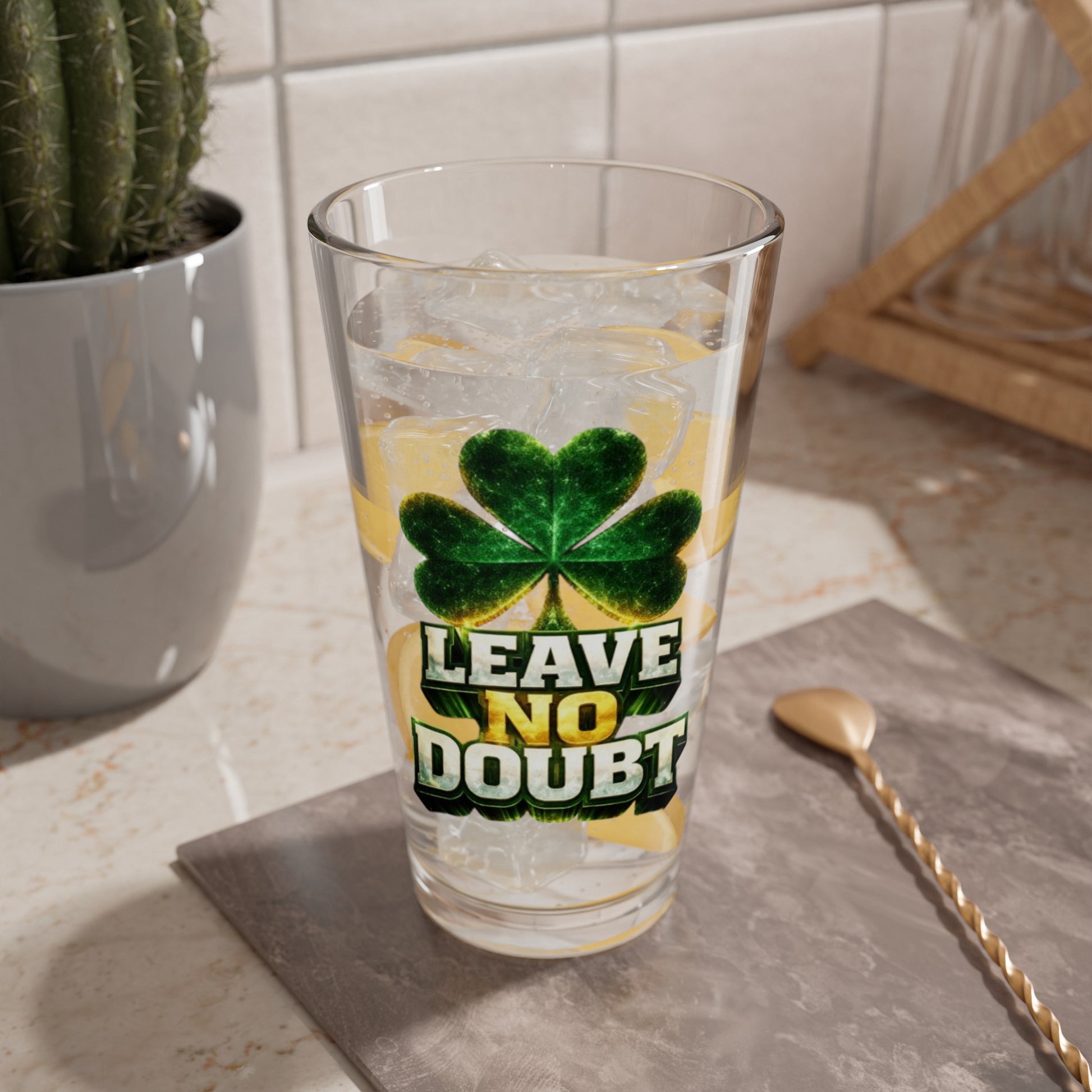 Raise a glass to bold evenings and lively gatherings with this 16oz mixing glass. Thick, clear glass and a heavy base give it steady confidence at the bar or on your kitchen counter. The deep green shamrock motif and strong “Leave No Doubt” lettering set a spirited, no-nonsense tone that fits rowdy game nights, Saint Patrick’s celebrations, or any time you want to make a statement while mixing cocktails. Use it to build stirred drinks, as a casual drinking glass, or as the reliable shaker when you’re crafting a whiskey-forward sip. It cleans easily in the dishwasher and the print stays vivid thanks to modern printing techniques—so the design keeps looking sharp through many rounds.